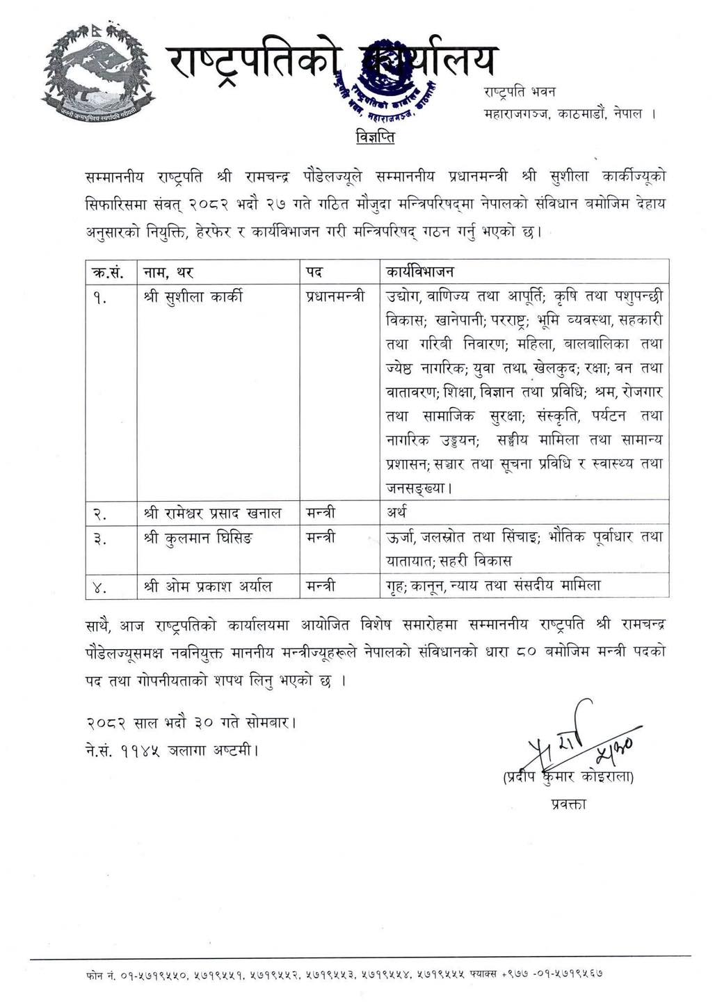 ३० भदौ, काठमाडौं । प्रधानमन्त्री सुशीला कार्कीले मन्त्रिमण्डल विस्तार गरेकी छन् । राष्ट्रपति रामचन्द्र पौडेलबाट राष्ट्रपति कार्यालयको भवन बाहिर सोमवार नवनियुक्त तीन मन्त्रीले शपथ लिएका छन् ।