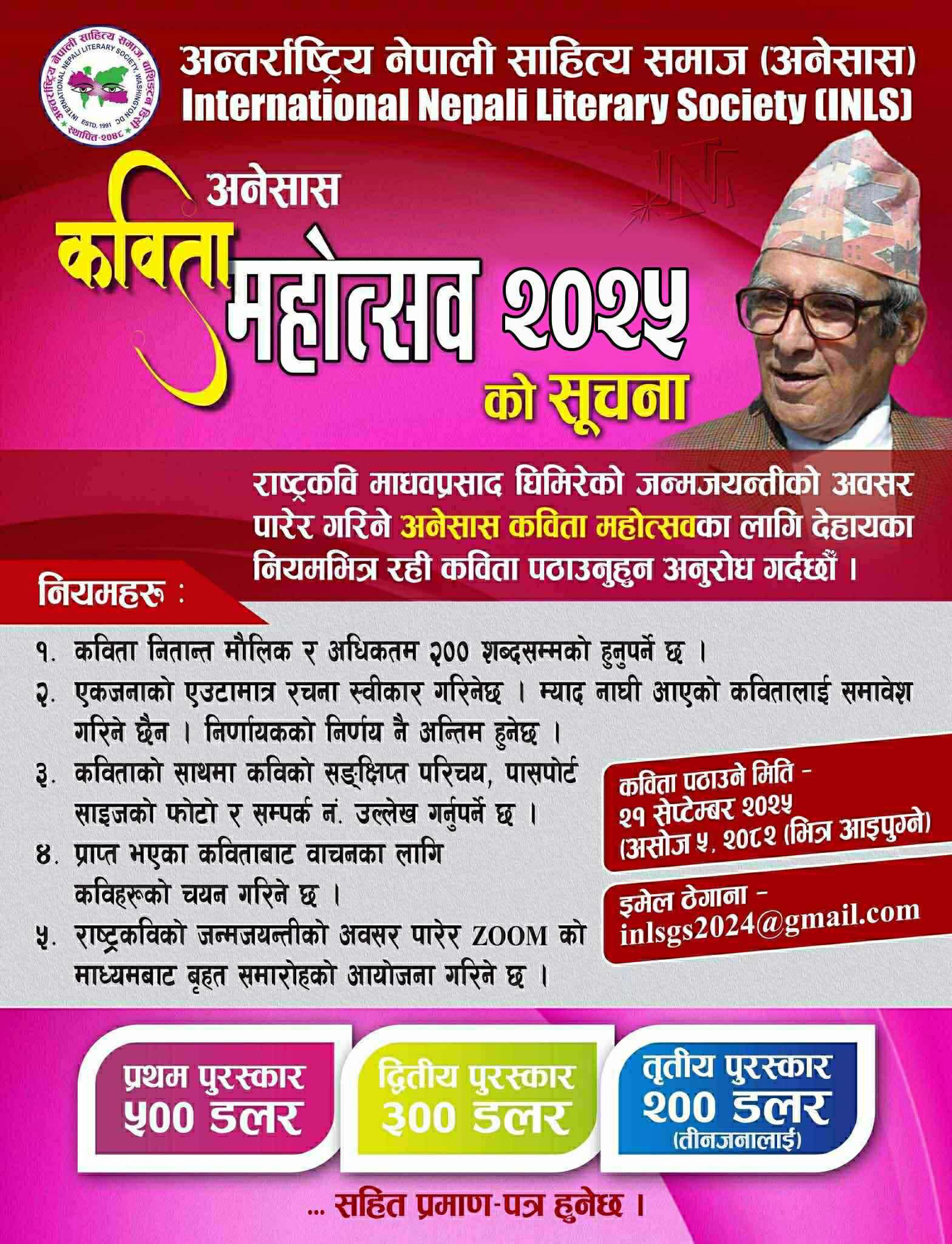 १७ असोज, पोखरा ।अन्तर्राष्ट्रिय नेपाली साहित्य समाज (अनेसास) ले राष्ट्रकवि माधवप्रसाद घिमिरेको जन्मजयन्तीका सन्दर्भमा हरेक वर्ष आयोजना गर्ने अनेसास कविता महोत्सवमा २८ कवि चयन भएका छन् ।