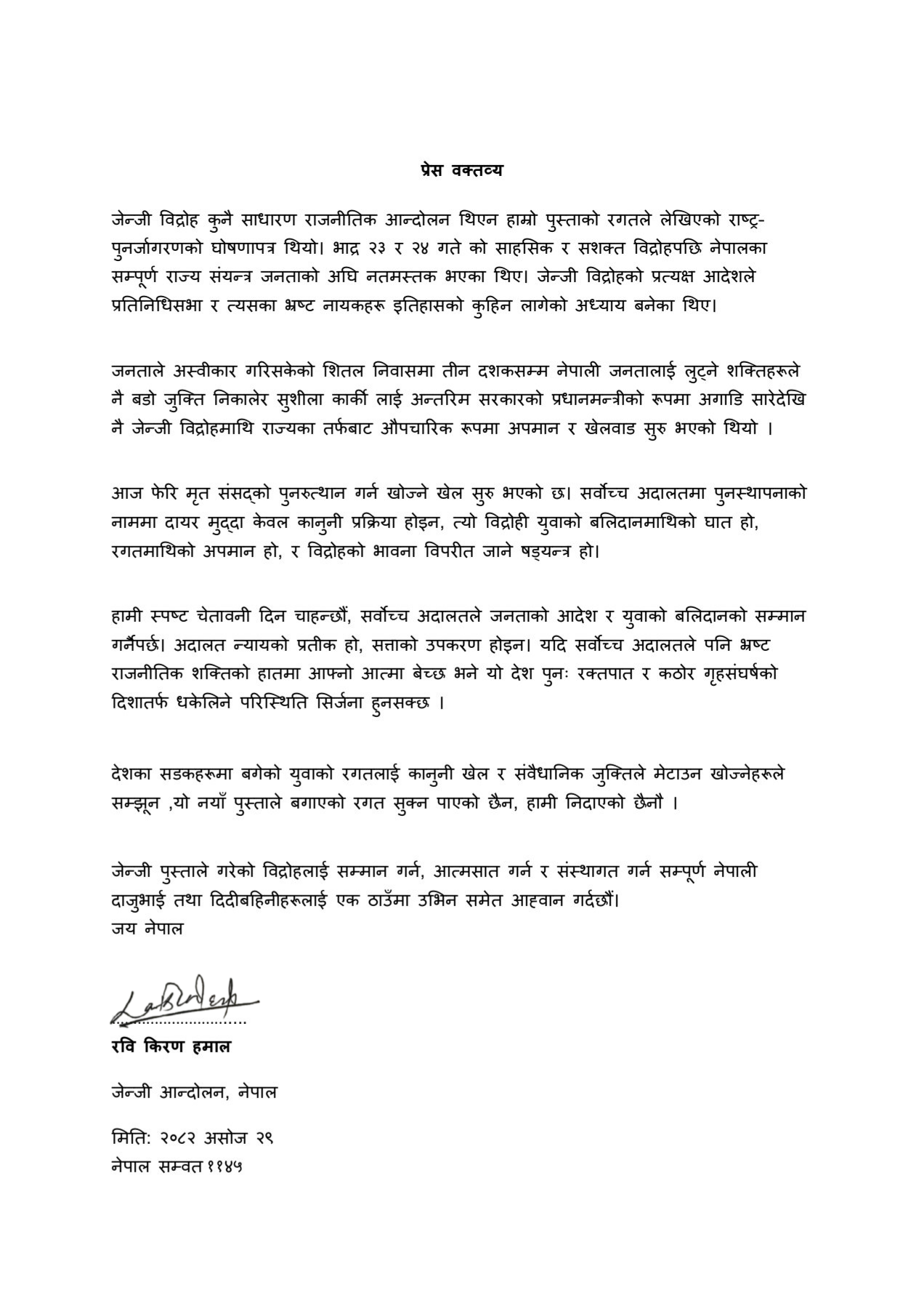 आन्दोलनका अगुवा रवि किरण हमालद्वारा जारी वक्तव्यमा भनिएको छ कि जेन्जी विद्रोह कुनै सामान्य राजनीतिक आन्दोलन नभई “हाम्रो पुस्ताको रगतले लेखिएको राष्ट्र–पुनर्जागरणको घोषणापत्र” हो।